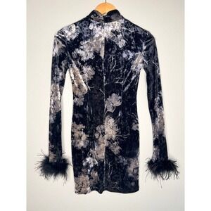 Keywords: Black Velvet Dress, Floral Print Dress, Cheongsam Dress, Mandarin Collar Dress, Feather Trim Dress, Gothic Dress, Evening Dress, Cocktail Dress, Party Dress, Long Sleeve Dress, Winter Dress, Designer Dress, Elegant Dress, Unique Dress