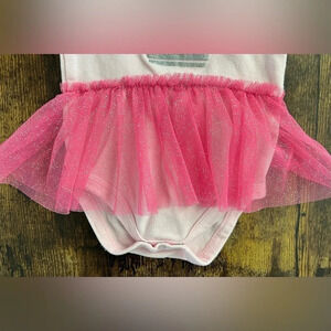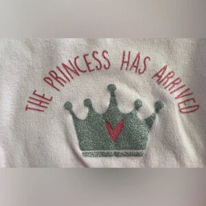 Swiggles | infant girl onesie. Size: 3/6M. Colors: hot pink, light pink, silver. 100% cotton. Baby girl onesie, 3 snap closure. The onesie has a soft flowy pink skirt with silver flecks throughout. “The Princess Has Arrived” with a silver crown that has a pink heart in it, silkscreened on the front. Good, used condition.