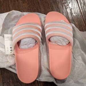 Stylish adidas sandals. Pink base with white stripes. Comfortable and trendy. Suede and white stripe. New.