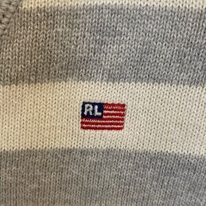 Stylish V-neck sweater. Gray and cream stripes. Iconic Ralph Lauren Flag logo.