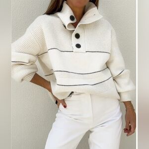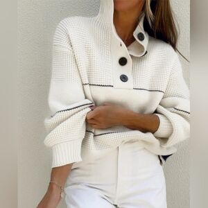 Chic cowl neck sweater with bold black stripes. Features stylish button accents. Perfect for layering.