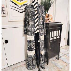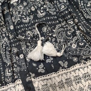 Featuring a full length button up closure and a tie with tassel at the waist, lace details, lined from the waist down and crafted with a bit of stretch for a comfortable flattering fit with excellent recovery, this can be worn open for the perfect lagenlook layering scandigirl piece with feminine hippie vibes or closed for a bohochic, elegant brunch style.