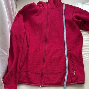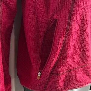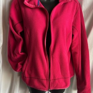 Bold pink waffle fleece jacket with a cozy hood and zipper pockets. Ideal for outdoor adventures. Excellent pre owned condition.
