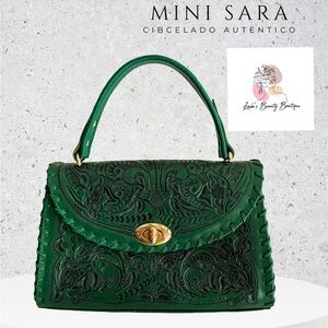 Green Handbag Mini Sara Hand-Tooled Artesian 100% Genuine Leather (H)