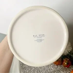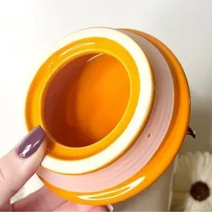 Rae Dunn Halloween Tricks and Treats Cookie Jar with Orange Topper and Ribbon Tie. New, but no tags, never displayed. Rubber seal for lid. Measures 8-1/2” tall, 6-1/2” wide.