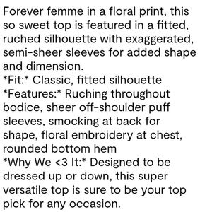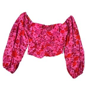 Hot pink and red floral print with 3D rosettes. Semi-sheer puff sleeves, back smocking, rounded hem.