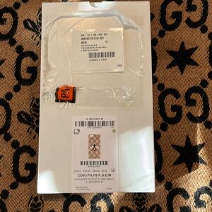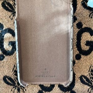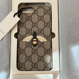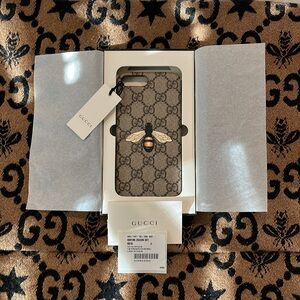 Elegant Gucci phone case with bee motif. Tan and black design. Ideal for style enthusiasts.