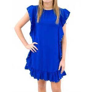 Meet the Studded Mini Dress by TCEC, a stunning addition in royal blue for your spring wardrobe. Crafted from 100% polyester, this dress features cap sleeves and a flattering shift silhouette with ruffle trim and gunmetal stone details. The high crewneck design finishes with a back button keyhole closure for a touch of elegance. Perfect for holiday parties, this captivating mini dress embodies minimalist trends with its textured pattern.