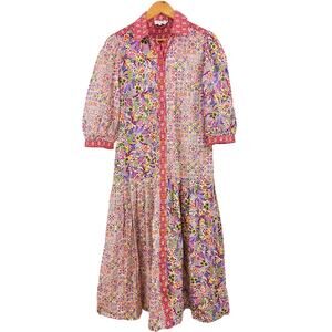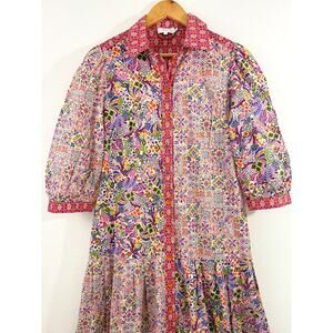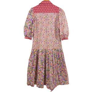 Beautiful colorful patchwork print dress by MIRTO 1956. Features a vibrant mix of paisley and geometric prints with contrast trim down the front placket. Button-front style with a relaxed, flowy silhouette.