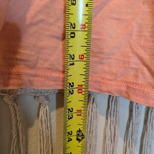 Elegant coral blouse with ruffled sleeves. Features intricate lace accents. Perfect for casual outings.