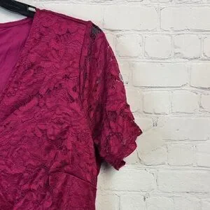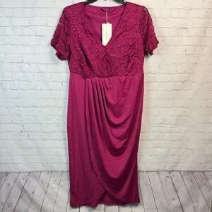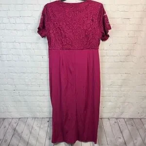 Chic stretchy fuchsia midi dress with lace top. Features a wrap-style skirt and snap closure at the bust. Ideal for elegant outings. Belt not included. Size 1X (14/16)