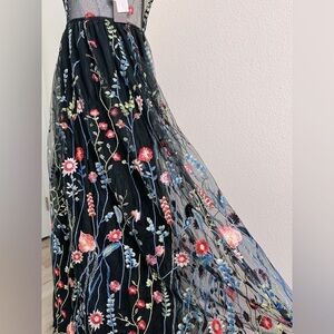 Elegant black dress with colorful floral embroidery. Features a sheer bodice and adjustable spaghetti straps. Perfect for special occasions. Excellent condition. No flaws. Please see photos for details and size guide.