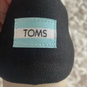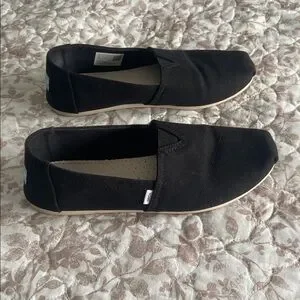 Sleek black canvas slip-ons by TOMS. Perfect for casual outings.