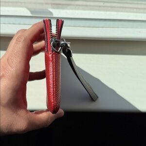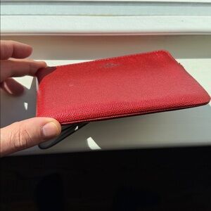 Elegant Coach wristlet in vibrant scarlet. Features a sleek metallic strap.