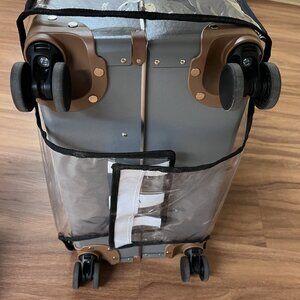 Large Globe Trotter Suitcase. Color: Grey with Caramel Leather Accents. Interior Cream/Canvas Color.