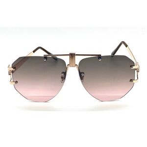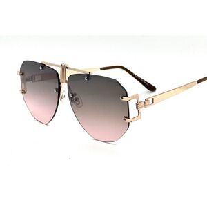 Chic and sophisticated eyewear to complete your ensemble. These rimless sunglasses feature a unique octagonal lens shape with a stylish gradient fade from gray to pink. The distinctive gold-tone metal frame adds a touch of luxury, highlighted by geometric detailing on the temples. These sunglasses are perfect for adding a fashionable edge to your everyday look, whether you're strolling through city streets or enjoying a sunny day at the beach. Ideal for brunch dates, vacation getaways, and fashion-forward events.