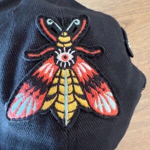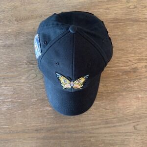 * Design: A classic black baseball cap with a central embroidered butterfly motif in yellow, blue, and red.