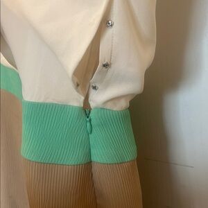 Anne Klein colorblock dress. A great addition to your spring wardrobe - side zip and snap closure. Measures 37 inches from back neck to hem. Comfort knit from green waist down with back pleat. Features iconic lion logo.
