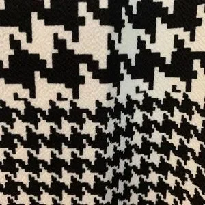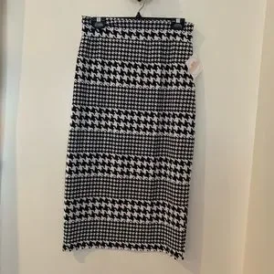 Houndstooth Ponte Knit Skirt. 30 inches long. This is a stretchy fabric skirt with a banded waist. Skirt is tapered at the bottom. No pockets.
