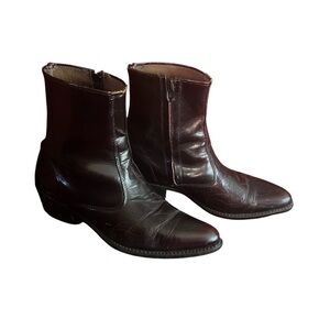 Acme Dark Wine Western Leather Ankle Boots. Size 8.5D. Western toe design. Side zippers. Typical Cuban heels. Total height 8 1/4”. Nice condition.