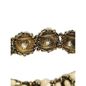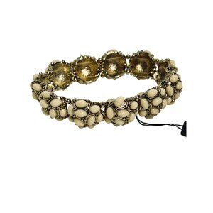 This vintage-inspired gold-tone bracelet features cream-colored oval cabochons and intricate detailing. Its stretch design ensures a comfortable fit for various wrist sizes.