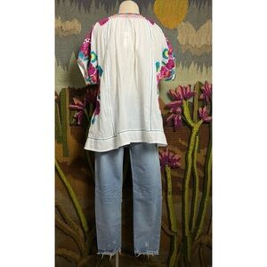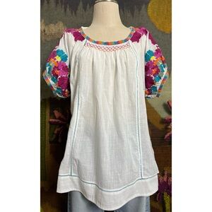 This gorgeous tunic by Anthropologie has vibrant fuchsia, teal, and yellow embroidered florals across the sleeves.
