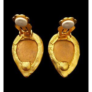Elegant vintage Carol Dauplaise clip-on earrings featuring a bold purple cabochon in a gold-tone teardrop frame. Timeless accessory for day or evening wear.