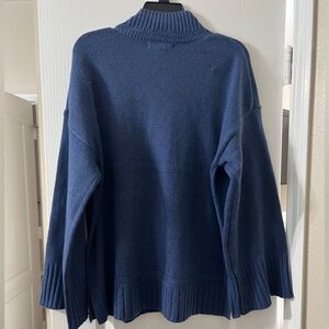 Elegant navy blue sweater. Features ribbed cuffs and hem. Soft and comfortable fabric.