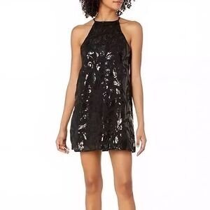 • halter neckline • above the knee length • fully lined • abolone shell button closure detail • relaxed fit • black dress with black sequins