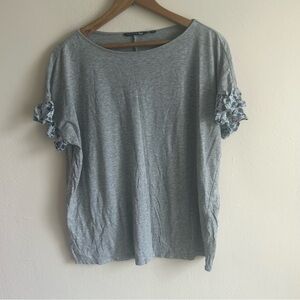 Elevate your basic tee with this feminine and comfortable piece. This gray heathered top features stunning ruffed "flutter" sleeves in a classic Sanderson blue and white floral print. Perfect for pairing with white jeans or a navy skirt for a polished yet relaxed look.