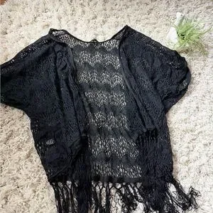 Stylish black lace kimono Chic Black Lace Kimono see thru short sleeve cardigan with Fringe elegant fringe. Ideal for layering. Small