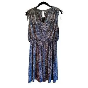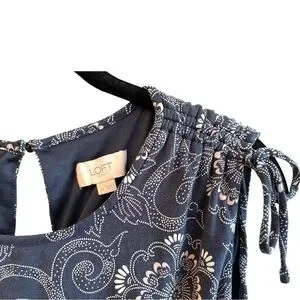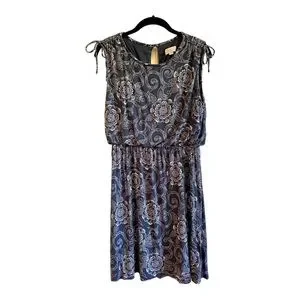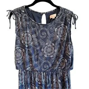 LOFT, CASUAL, SLEEVELESS DRESS IN BLUE PRINT, WITH TOUCHES OF PINK & WHITE. TIES AT SHOULDERS, ELASTIC FLOUNCE WAIST, KEYHOLE BACK OPENING WITH BUTTON CLOSURE. SIZE M