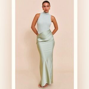 PrettyLittleThing Sage Green Mesh Racer Satin Skirt Maxi Dress