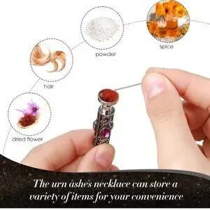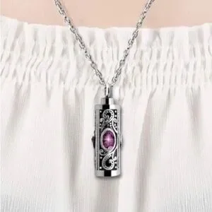 Stainless Steel Cremation Urn Necklace For Ashes With Purple Stone. This necklace can be worn as a necklace or kept as a keepsake to remember a loved one. It can be filled WTH by only ashes but a lock of hair or their favorite perfume scent. This includes a mini Funnel and push pin for easy filling.