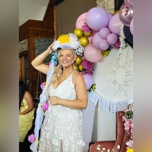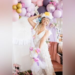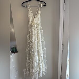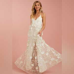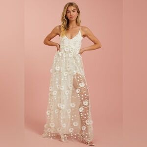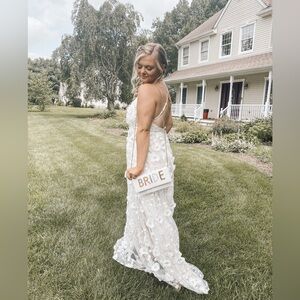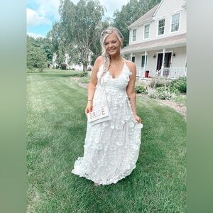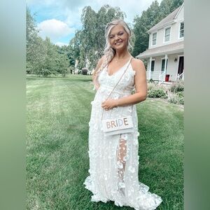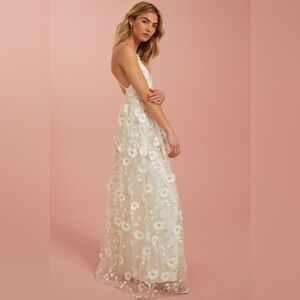 Beautiful white/off white 3D floral gown, perfect for bridal events. I was planning to wear to my bridal shower, but sadly I need a larger size. This dress is absolutely gorgeous and I love it so much, I'm on the hunt for an XL or even XXL. Def willing to trade for the same dress if anyone is needing a size L.