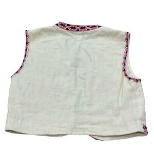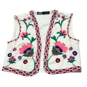 Cream vest adorned with pink, green, and purple floral patterns. Intricate embroidery adds elegance.