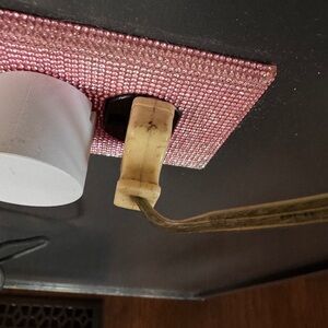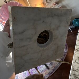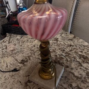 Charming lamp with pink swirl glass and gold accents. Adds elegance to any space…..miss large globe piece that’s why the price is significantly below retail