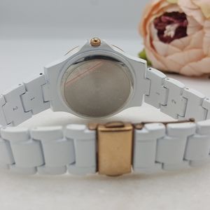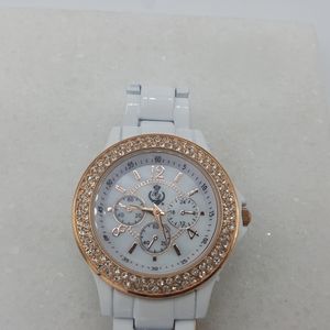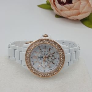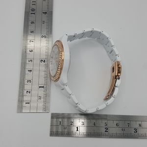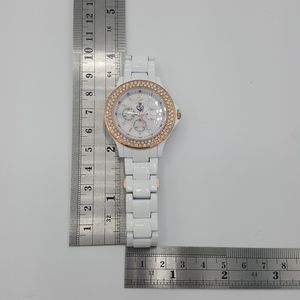 Premier Designs brand. Women's wristwatch. Featuring a white dial, a ceramic-style bracelet, crystal accents and rose gold details. In good condition.