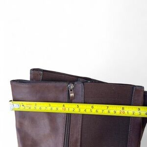 Chic brown knee-high boots with stylish buckles. Perfect for elevating any outfit. Great for wide calves. About 18” calf opening with elastic for added comfort.