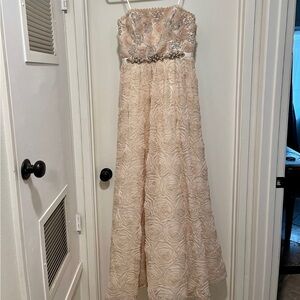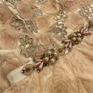 The details are stunning. The color is like a blush/nude. The fabric feels so good and the rosettes are timeless.