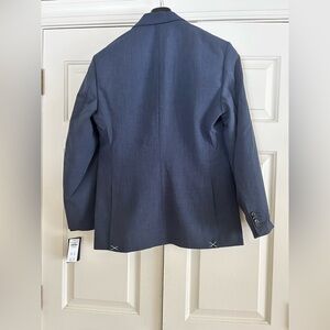 Garment bag included. Sophisticated navy blue blazer. Ideal for business or casual events. Tailored fit with classic design.