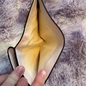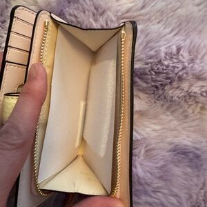 Pebble leather lemon yellow bi fold wallet with gold hardware. Such a beautiful wallet with two tones. It’s like a pink inside and the lemon color outside. In the photo it looks cream, but I can promise you it’s a light textured yellow. Not a bright yellow. Very smooth leather. New with tags. So no low ballers! Smoke free home. 10 card slots with an ID location. Room for change and bills.
