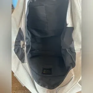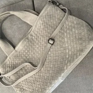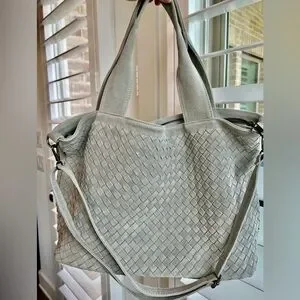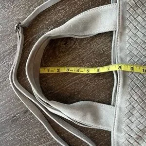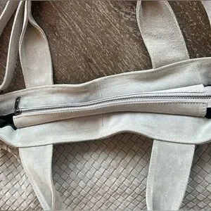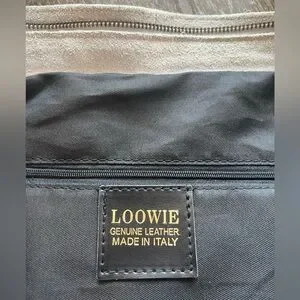 Elevate your style with this chic gray genuine leather woven tote bag. Made by Loowie in New York. Its sophisticated design and roomy interior make it ideal for daily use. It has never been used, very clean, and has a beautiful leather smell. Zippers work perfectly. Removable Long strap is adjustable, but measures 26” as currently set in photos. Gunmetal color metal.