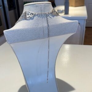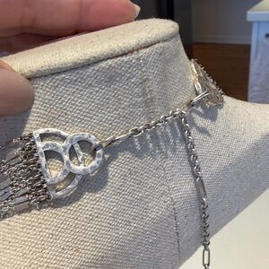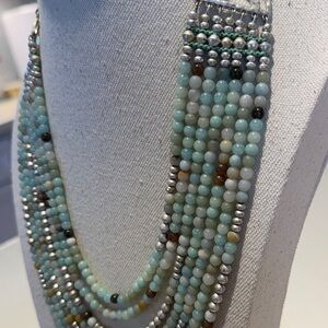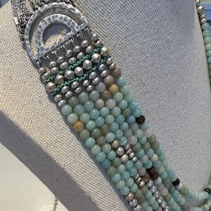 A gorgeous artisan made seven strand and so night necklace with one of the most unique claps I've ever seen. The necklace is 19 inches in length with an additional 8 inches on the back extension. The chain can also hang seductively down the back of the neck. It is very Art Deco and style and truly beautiful. There are hand, crocheted, spacers and turquoise silk thread at the back of the piece. See pictures.