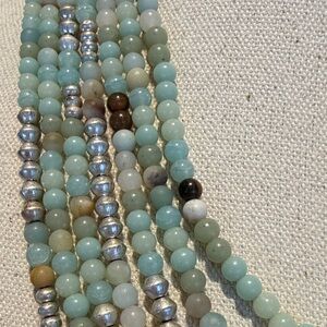 This stunning necklace features a blend of blue, brown, and silver beads, perfect for adding a touch of elegance to any outfit. The intricate design showcases a harmonious mix of colors, making it a versatile accessory for any occasion.