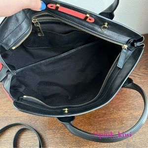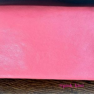 Used and in very good condition. Some marks and scratches on exterior of bag. Small dark mark on pink above front pocket (photo 3). Some color transfer from back black pocket onto pink (photo 14) Hard to get in photos. Not overly noticeable. May have some color transfer on side. Tried to get in photo 7. May also be the color itself. Very hard to tell. Some wear and color rubbed off on corners (photo 15). Wear to bottom of bag, including feet. A couple tiny dark spots on pink. Some cracking on edging on side and handle. Light wear to hardware. Interior is a bit dusty/lint. See photos for all of this and anything I missed mentioning.