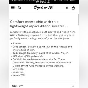 New - Madewell Alpaca-Blend Mockneck Puff Sleeve Sweater