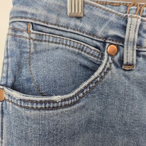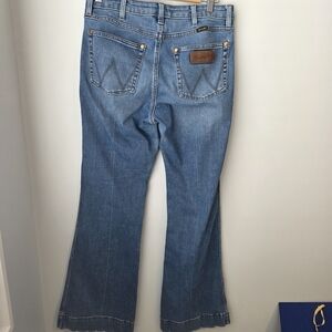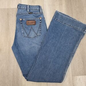 Classic boot cut style. Light blue denim. Iconic Wrangler back pocket design.