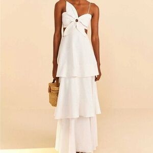 Rare Farm Rio white maxi dress with flower front. Features tiered layers for a flowing look.