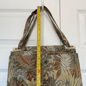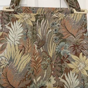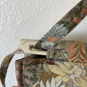 Toby Weston vintage tapestry shoulder bag featuring a richly woven floral and botanical pattern in earthy fall tones — sage green, rust, taupe, cream, and muted blue. Classic carpet-style fabric with a structured silhouette and comfortable shoulder strap.